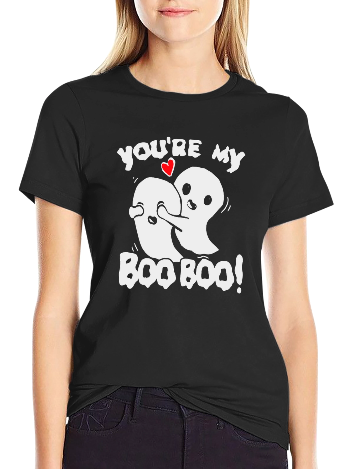Show your spooky and sweet side with this black t-shirt featuring two adorable cartoon ghosts embracing! Above the ghosts, the phrase "You're my" is playfully written, punctuated with a cute red heart. The saying "BOO BOO!" is written below, completing the ghostly love theme. This comfortable shirt is perfect for casual wear, Halloween events, or as a fun gift for your boo. Express your unique style with this eye-catching and comfortable tee!