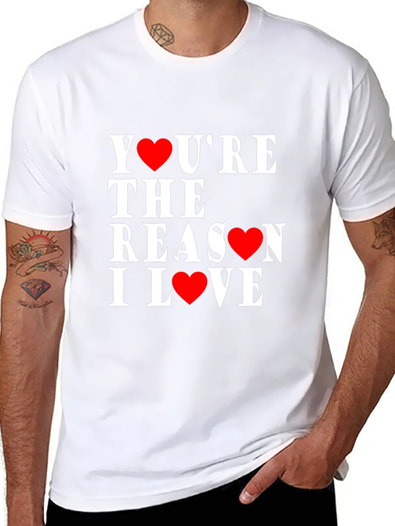 Show your affection with this stylish black T-shirt. Featuring the phrase "You're The Reason I Love" with heart symbols. This tee is made of comfortable material, perfect for casual wear. Express your feelings and make a statement with this unique and eye-catching design. Great for everyday wear, date nights, or as a thoughtful gift. Grab yours now and spread the love!