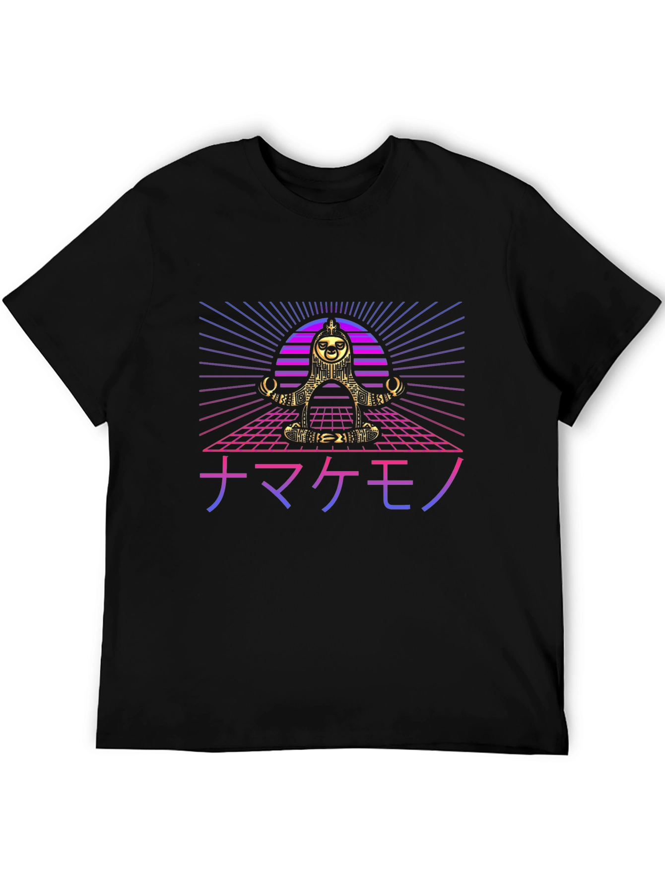 Embrace the chill vibes with this unique black t-shirt. Featuring a stylized sloth meditating within a retro-wave inspired design, this shirt blends humor with a touch of zen. The vibrant purple and pink grid and sunburst create a cool, 80s aesthetic. The Japanese text adds an element of intrigue. Crafted from comfortable, breathable fabric, this tee is perfect for casual wear, lounging, or making a statement. Show off your relaxed attitude and stand out from the crowd. Makes a great conversation starter or a fun gift for sloth lovers.